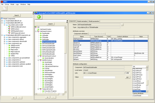 O JUICE é um editor gráfico para a geração de definições de modelos JAMS Para chamar o JUICE quase os mesmos argumentos de linha de comando são válidos como eles são para o JAMS. A única diferença é que usando a opção "-m" ou "--model" a arquivo de definição de modelo é dada e não arquivo de configuração do modelo Se JUICE for chamado sem argumentos, um novo arquivo de configuração do sistema com configurações padrão será criado no diretório de execução. A imagem a seguir mostra o JUICE depois que uma definição de modelo tiver sido carregada.